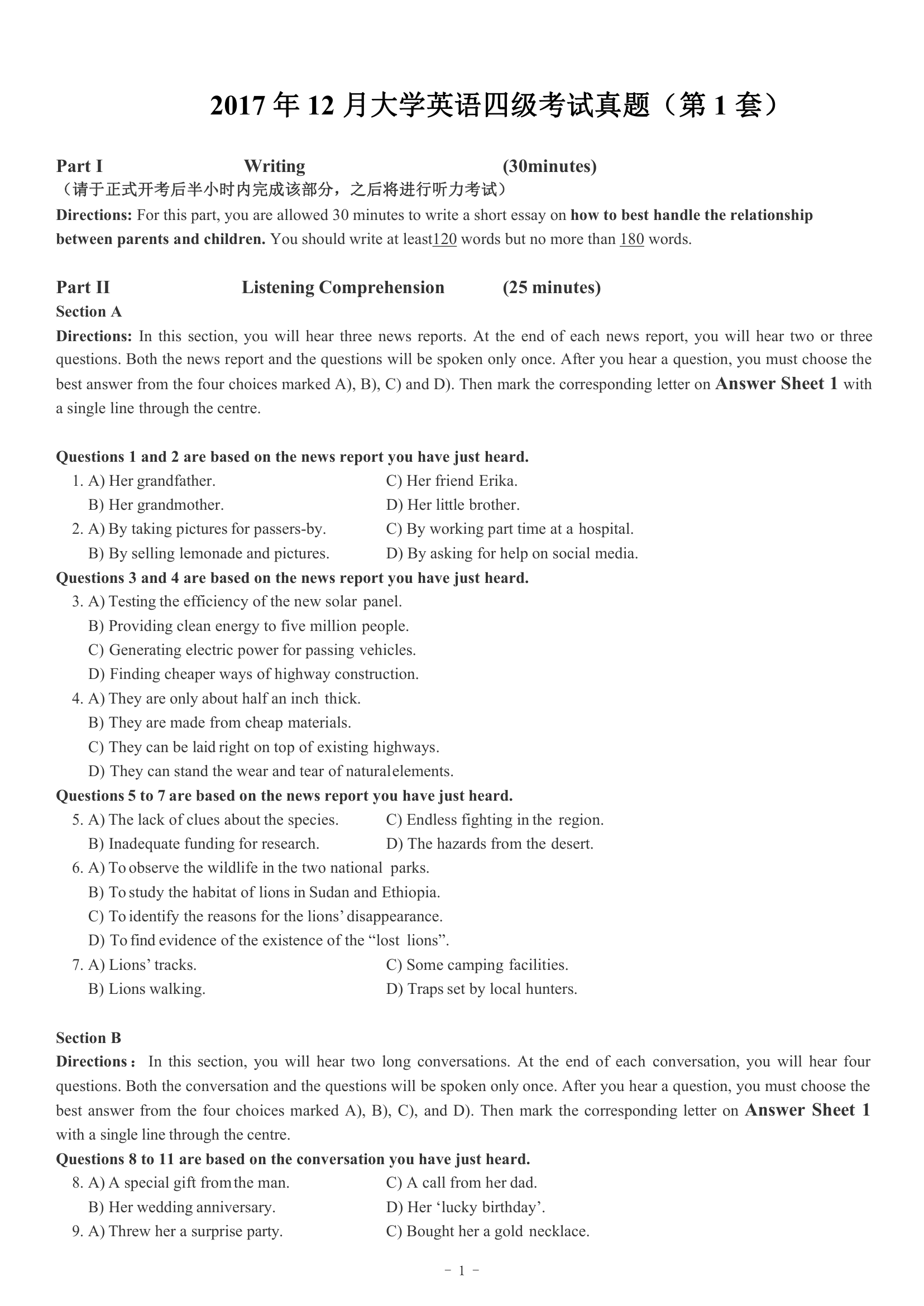 2017年12月英语四级真题(卷一)