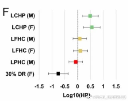 一点都不令人意外:低碳水高蛋白(LCHP)的组死得最早,低脂肪高碳水(LFHC)的组活得最长。(图 2,左边是雄性小鼠的寿命图,右边是雌性小鼠的寿命图。线条最靠右的,就是最长寿的组。)