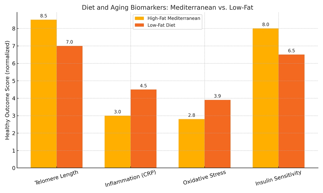 与低脂饮食相比,高脂的地中海饮食与更长的端粒、更低的炎症水平(CRP)、更少的氧化应激和更高的胰岛素敏感性相关——这些都是健康衰老的关键标志。