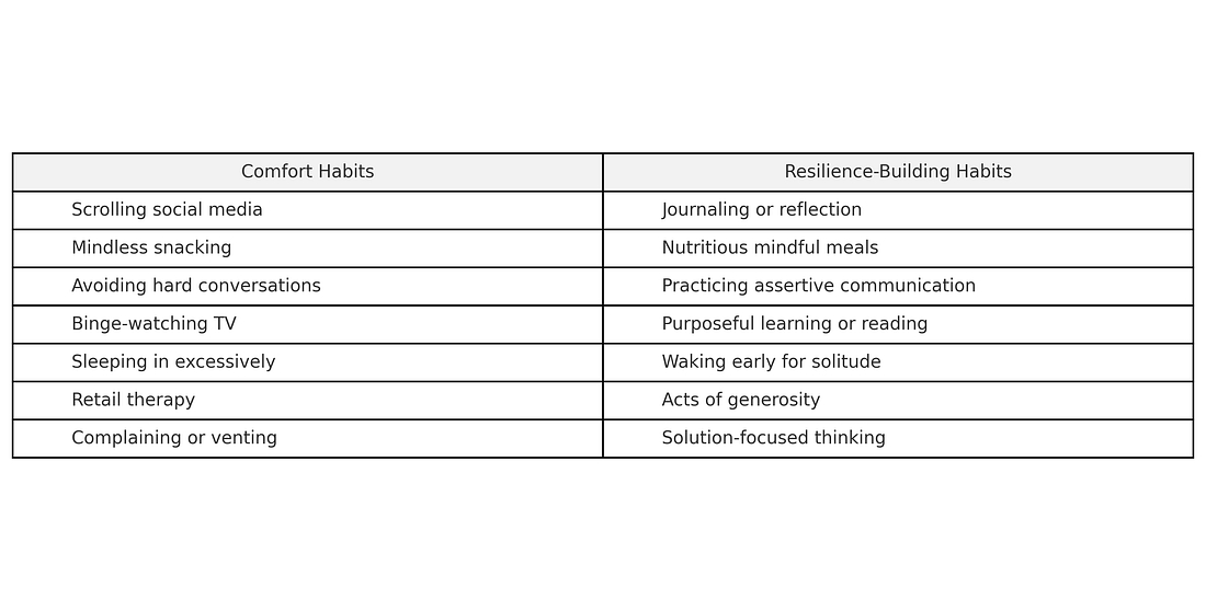 “舒适型”习惯能提供短暂的慰藉,但往往会侵蚀长期的力量。而“复原力构建”习惯刚开始可能感觉更难,但随着时间的推移,它们会增强你的情绪耐力、清晰度和自尊。