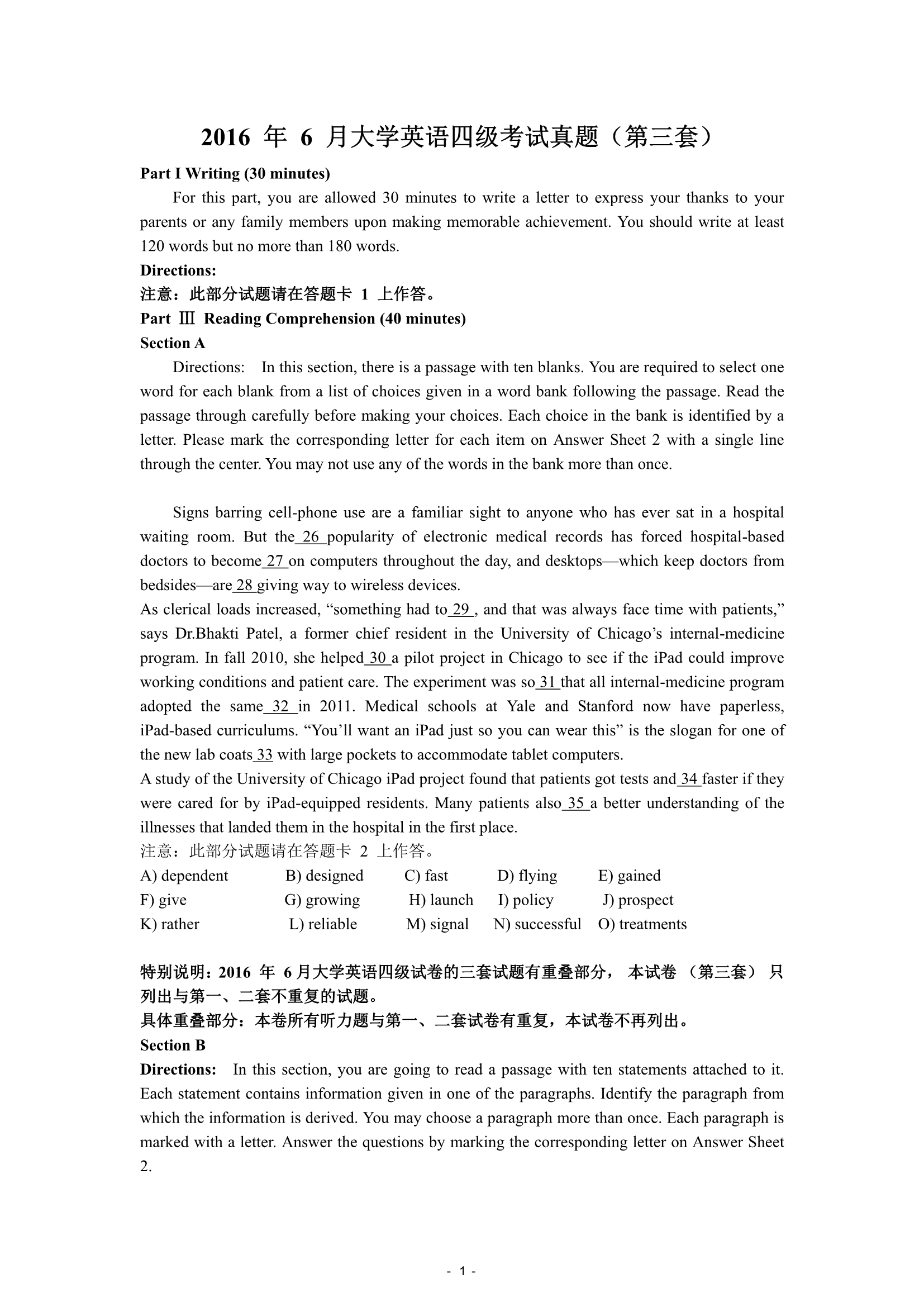 2016年6月大学英语四级真题(第3套)