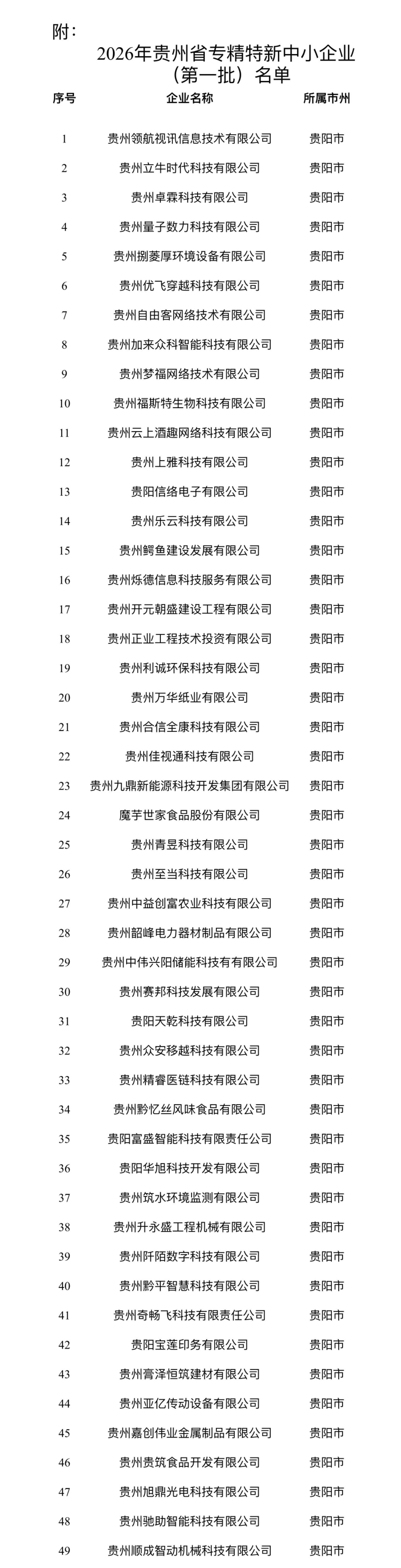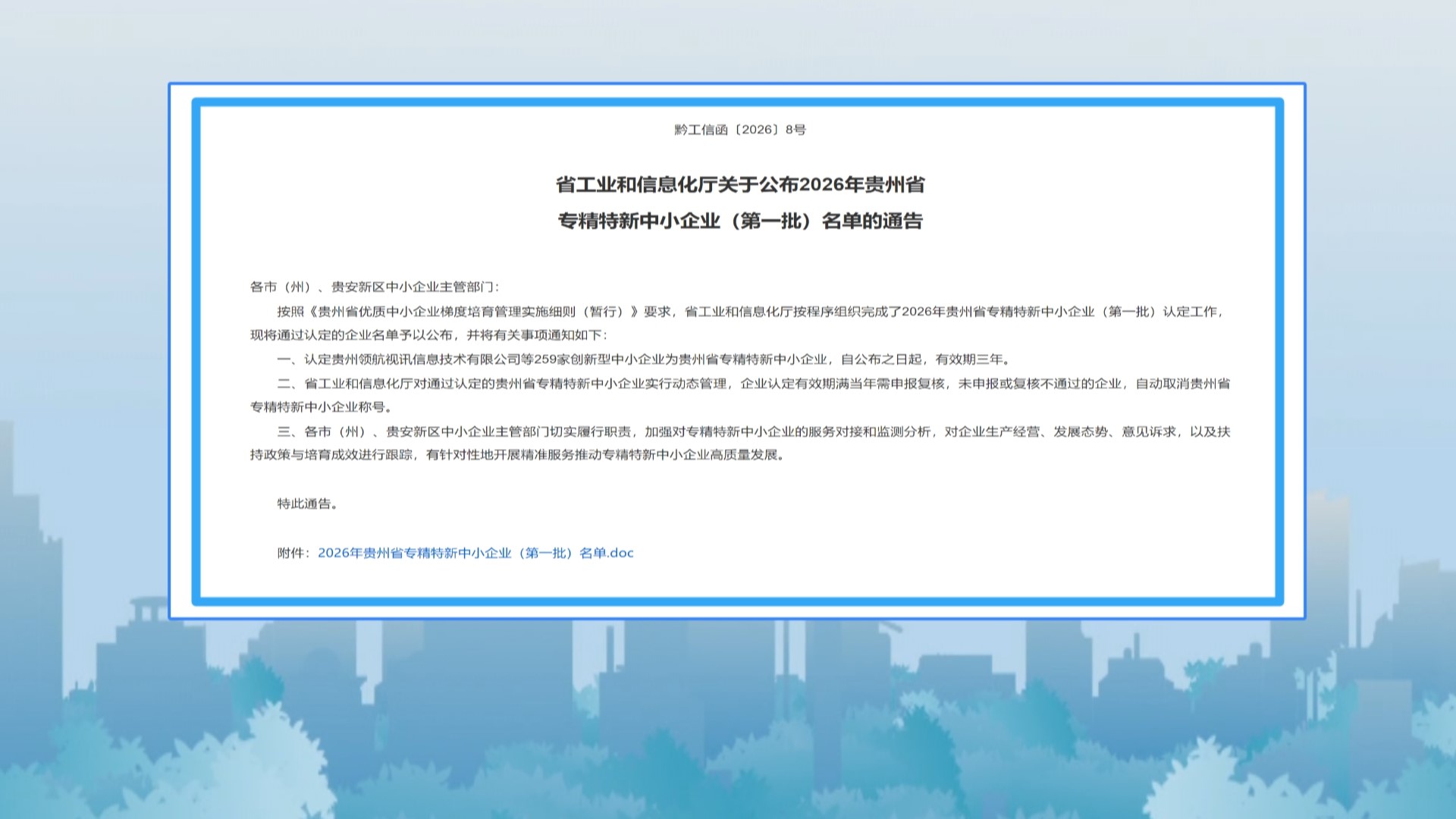 省工业和信息化厅日前公布2026年贵州省专精特新中小企业(第一批)名单,贵州领航视讯信息技术有限公司、贵州贝加尔乐器有限公司、贵州太平洋纺织有限公司等259家创新型中小企业成功入选,认定有效期为三年。