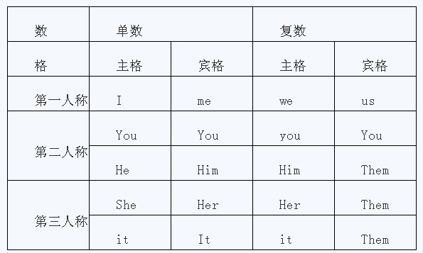 表示“我”、“你”、“他”、“她”、“它”、“我们”、“你们”、“他们”的词,叫做人称代词。人称代词有人称、数和格的变化,见下表: